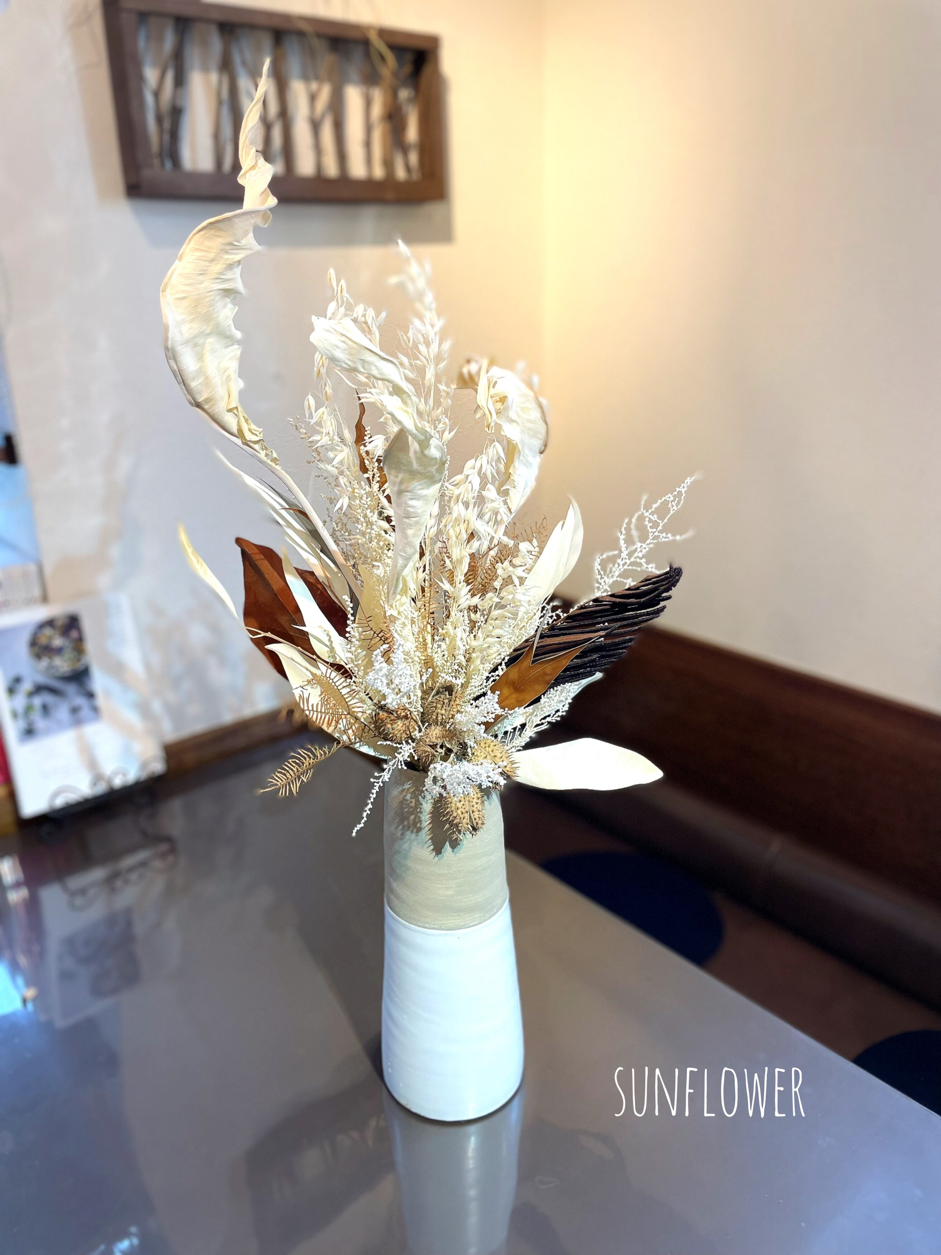カラードドライのストレチアリーフを主に、ナチュラルドライのイガナス、ガンソクと、柔らかで嫋やかなアイボリーのプリザーブドストーベ、プリザーブドウィローユーカリを添えて、アイボリーベージュのナチュラルな花束に仕上げました。