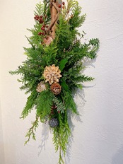クリスマスのアレンジメントです。植物本来の香りと、ナチュラルな風合いがお部屋を彩ります。縦にかけられるスワッグなので、玄関やリビングのドアに飾ってみてください。フレッシュでお作りしてそのままドライになるまで長く飾って頂けます。華やかさと温かみを取り入れたい方に・・・